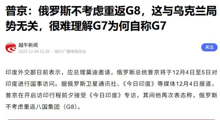 面对媒体采访,普京直言不讳的说,某些G7国家的经济权重还不如印度,不明白为什么叫“G7”,在俄罗斯,G明明是是‘伟大、大事’的缩写。