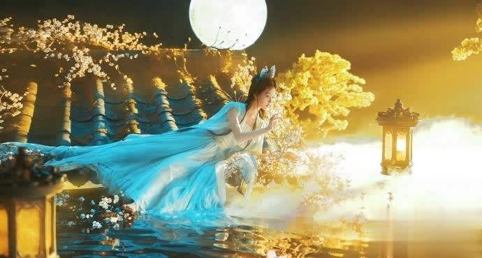 陈都灵身处古意盎然的场景中,周围云雾缭绕,灯火摇曳。她的长裙在水中拖曳,与周围的建筑、花木相映成趣。她专注于手中的花枝,神情认真,仿佛在精心雕琢一件艺术品。整个画面色调温暖又带着一丝朦胧的仙气,将她的美全方位展现,仿佛是一场穿越时空的邂逅,让人沉醉其中。