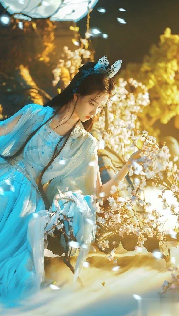 转身走入繁花秘境,陈都灵指尖轻抚枝头白花的姿态溢出书卷气。发冠与裙裾的淡蓝渐变,与金黄光晕中的花枝形成色彩诗篇。此景令人想起她访谈中的金句:“演戏如种花,要静待绽放”,恰似其不争不抢却终迎繁花似锦的演艺之路。
