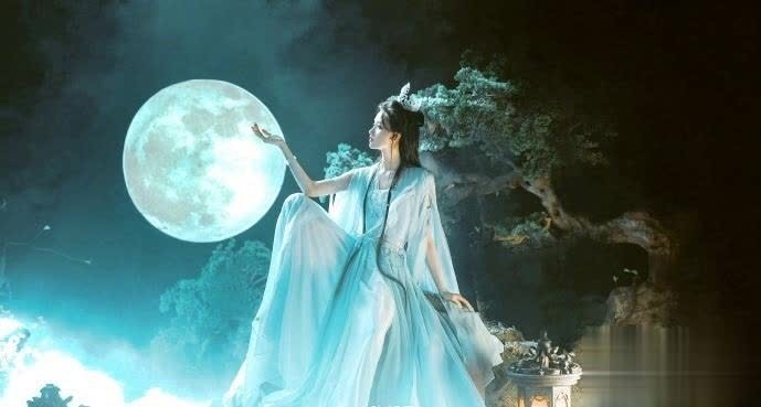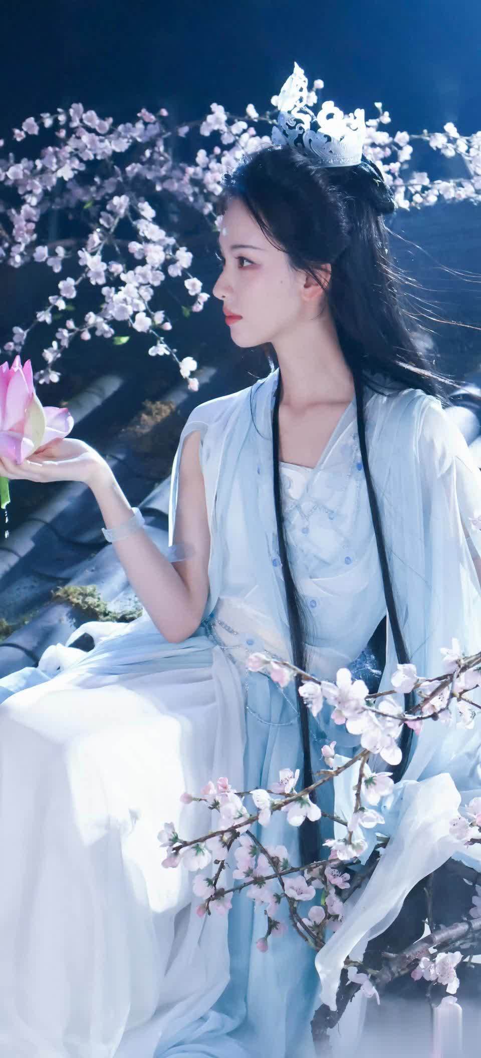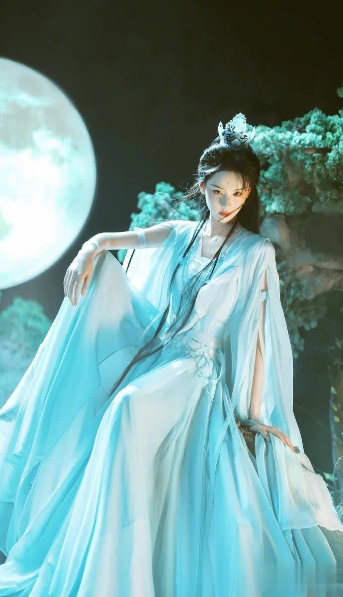 坐姿优雅大气,淡蓝色的长裙铺展开来,如同一片轻柔的云彩。月光为她镀上一层柔和的光晕,身后的树木郁郁葱葱,更显她身姿的纤细。她的神态从容淡然,仿佛早已习惯了这份美好,举手投足间都散发着优雅的气质,就像从古典诗词里走来的大家闺秀,温婉又端庄。