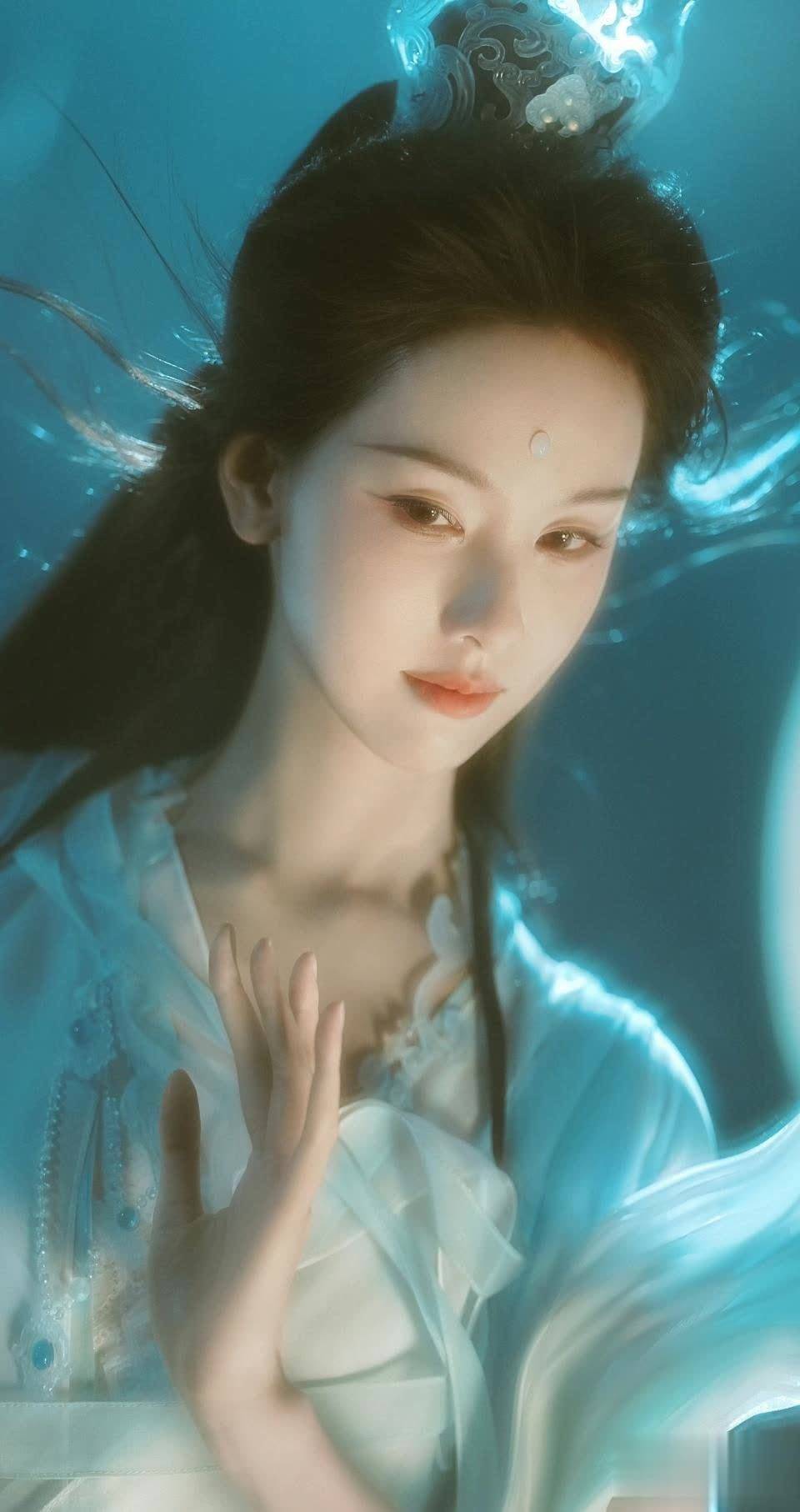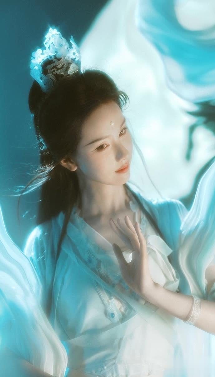 首张写真中,陈都灵一袭浅蓝纱衣翩若惊鸿,银色发冠在光影间流转细碎星芒。她低眉轻抬素手,身后云雾氤氲的蓝白背景仿佛自带仙侠BGM。尤其点睛的是额间珍珠,与盘发间垂落的几缕青丝共舞,瞬间将“犹抱琵琶半遮面”的含蓄美定格成永恒。