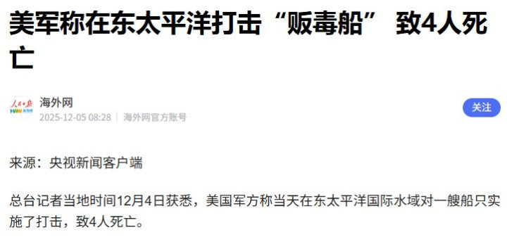 海外网 美军称在东太平洋打击“贩毒船” 致4人死亡