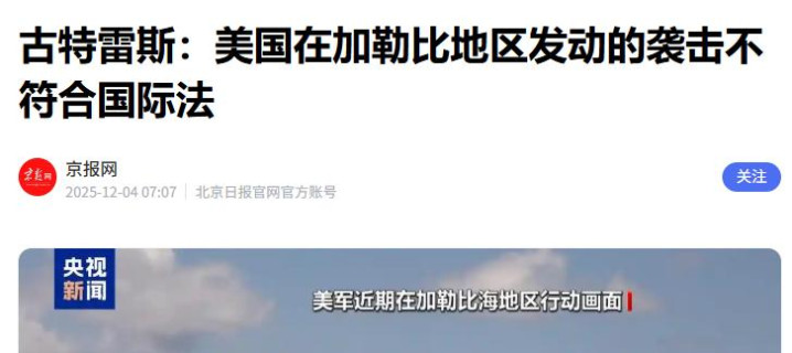 12月3日,联合国秘书长古特雷斯明确表示,美军的军事行动已违反国际法,强调“军事对抗不是解决方案”。